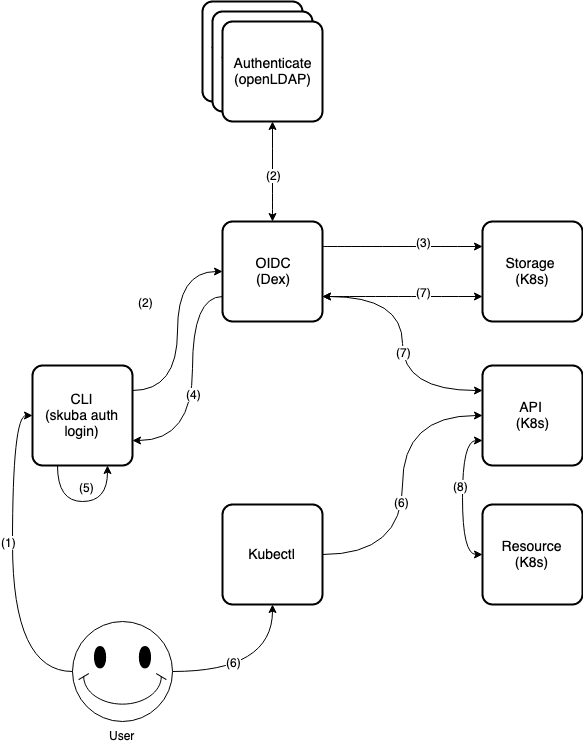 Dex continues with OIDC authentication flow on behalf of the user and creates/updates data to Kubernetes CRDs.