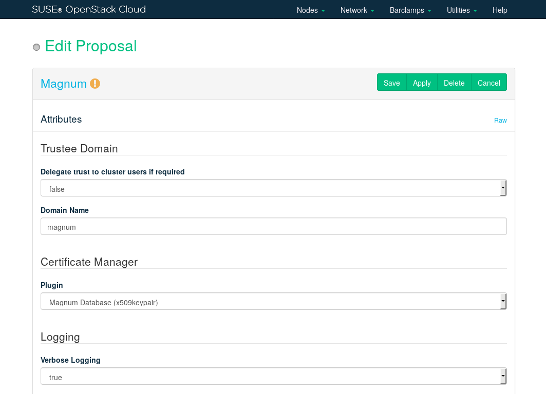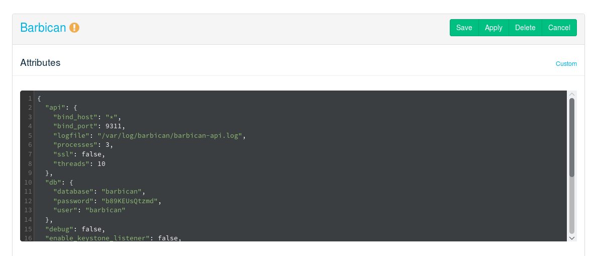 An optional nested hash containing any attributes for this proposal which deviate from the defaults for the barclamp.