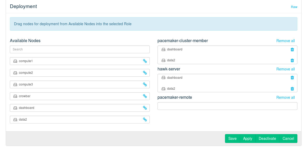 After the nodes are installed and configured you can start deploying the OpenStack components to finalize the installation. The components need to be deployed in a given order, because they depend on one another. The component for an HA setup is the only exception from this rule—it can be set up at any time. However, when deploying SUSE OpenStack Cloud Crowbar from scratch, we recommend deploying the proposal(s) first. Deployment for all components is done from the Crowbar Web interface through recipes, so-called “barclamps”. (See Section 12.23, “Roles and Services in SUSE OpenStack Cloud Crowbar” for a table of all roles and services, and how to start and stop them.)
