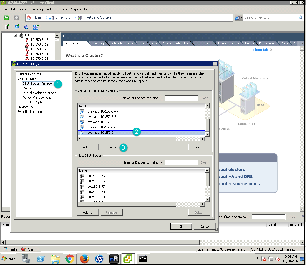 Click DRS Groups Manager on the left hand side of the pop-up box. Select the group which is created for deleted OVSvAPP and click Remove.
