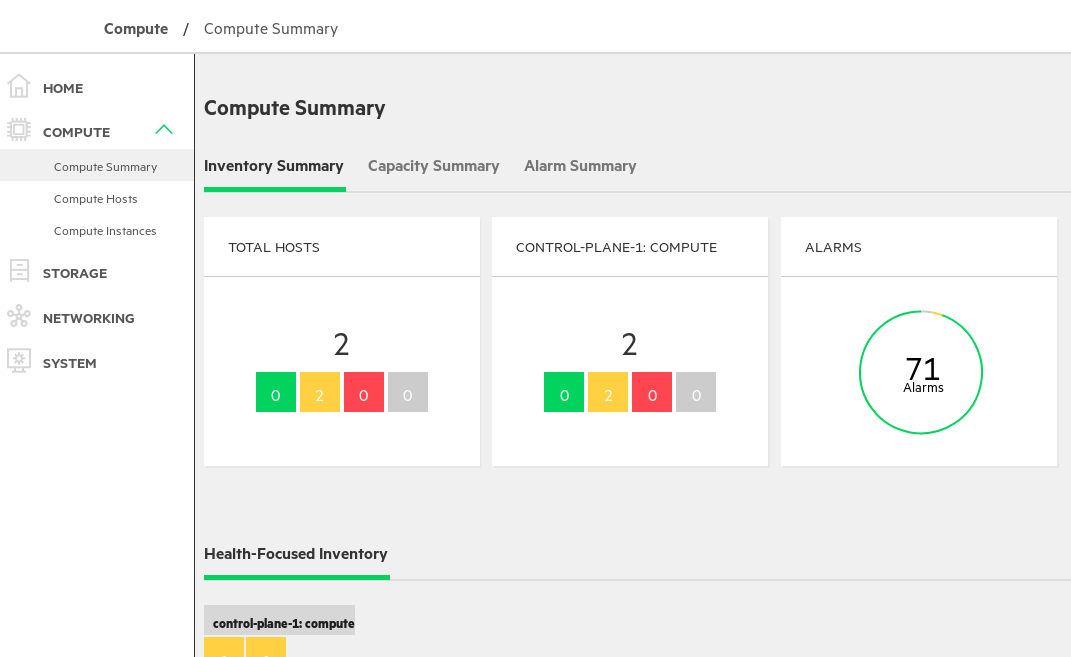 The section provides an overview of compute alarms by status. These alarms are grouped by control plane. There is also information on resource usage for each compute host. Here you can also see alarms triggered on individual compute hosts.