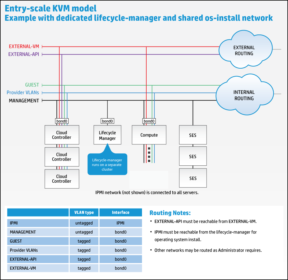 All of the example configurations included host the Cloud Lifecycle Manager on the first Control Node. It is also possible to deploy this service on a dedicated node. One use case for wanting to run the dedicated Cloud Lifecycle Manager is to be able to test the deployment of different configurations without having to re-install the first server. Some administrators prefer the additional security of keeping all of the configuration data on a separate server from those that users of the cloud connect to (although all of the data can be encrypted and SSH keys can be password protected).