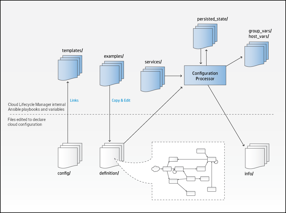 The relationship between the file systems on the SUSE OpenStack Cloud deployment server and the configuration processor is shown in the following diagram. Below the line are the directories that you, the cloud administrator, edit to declare the cloud configuration. Above the line are the directories that are internal to the Cloud Lifecycle Manager such as Ansible playbooks and variables.