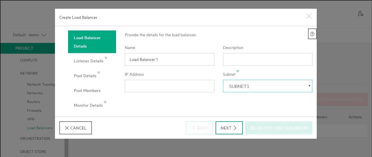 Provide the Load Balancer details, Load Balancer Name, Description (optional), IP Address and Subnet. When complete, select Next.