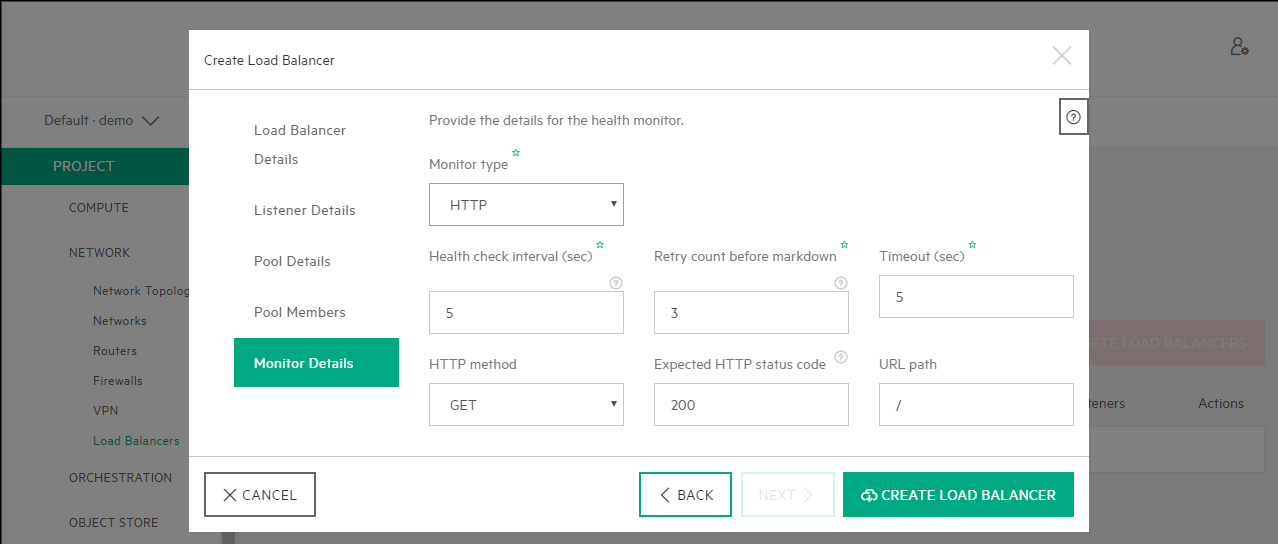 Create Health Monitor by providing the Monitor type (HTTP, PING, TCP), the Health check interval, Retry count, timeout, HTTP Method, Expected HTTP status code and the URL path. Once all fields are filled, select Create Load Balancer.