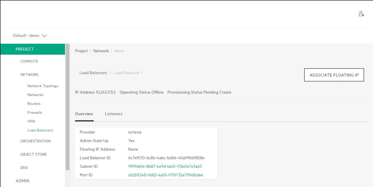 Once Load Balancer 1 has been created, it will appear in the Load Balancers list. Click the Load Balancer 1, it will show the Overview. In this view, you can see the Load Balancer Provider type, the Admin State, Floating IP, Load Balancer, Subnet and Port ID's.
