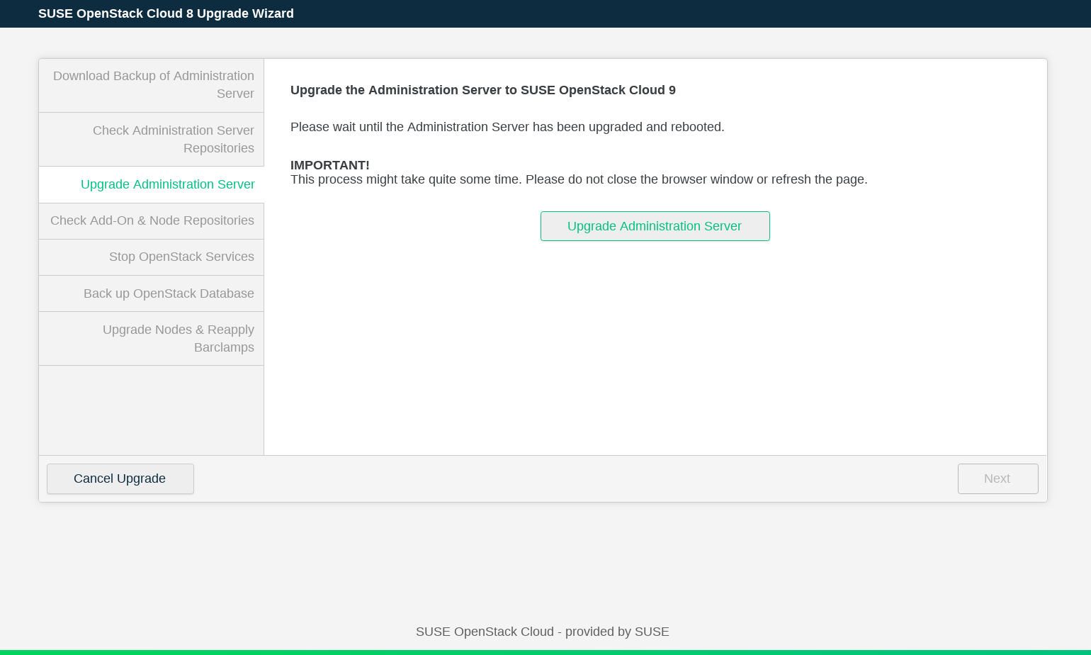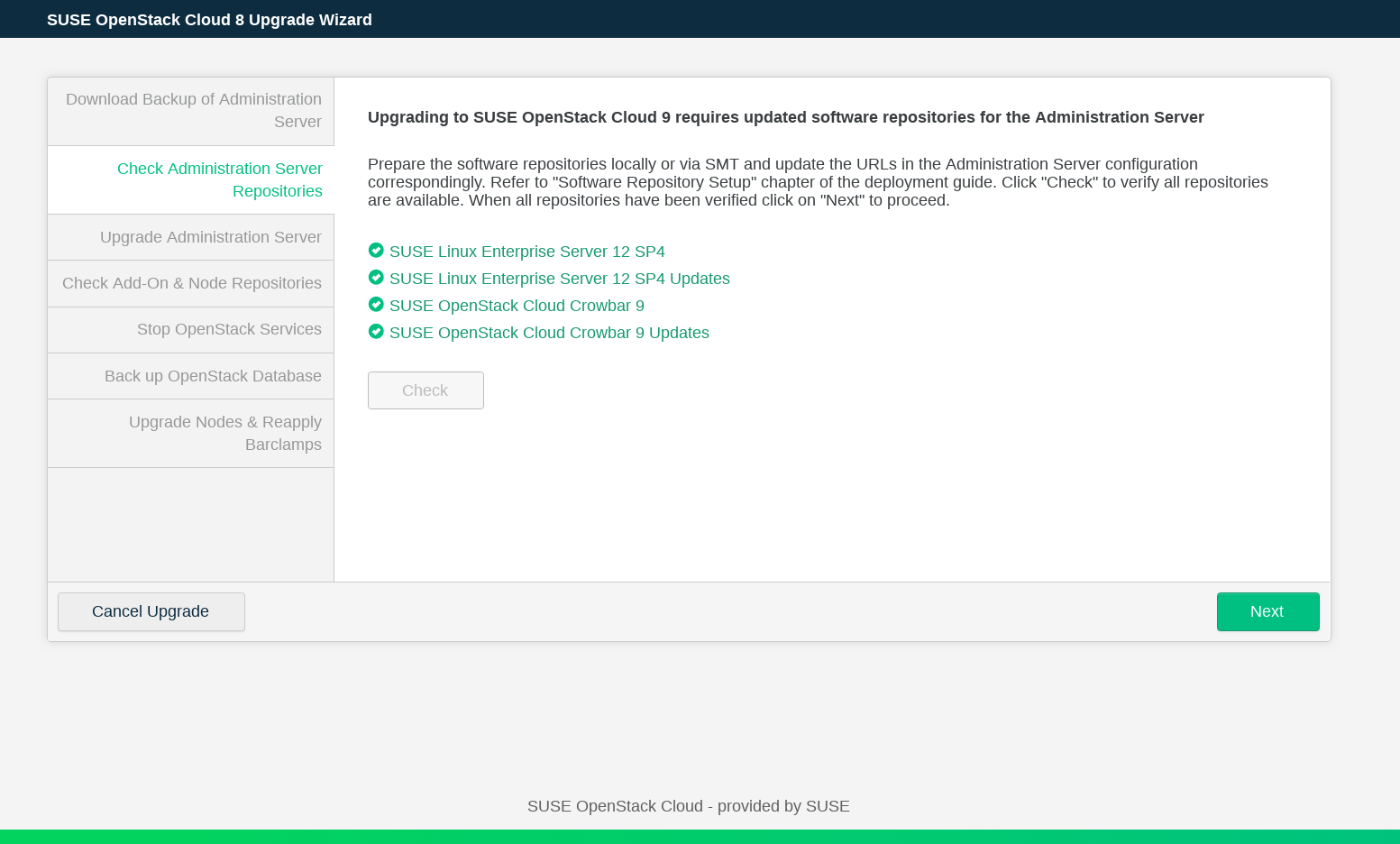 Upgrading from SUSE OpenStack Cloud Crowbar 8 to SUSE OpenStack Cloud Crowbar 9 can be done either via a Web interface or from the command line. SUSE OpenStack Cloud Crowbar supports a non-disruptive upgrade which provides a fully-functional SUSE OpenStack Cloud operation during most of the upgrade procedure, if your installation meets the requirements at Non-Disruptive Upgrade Requirements.