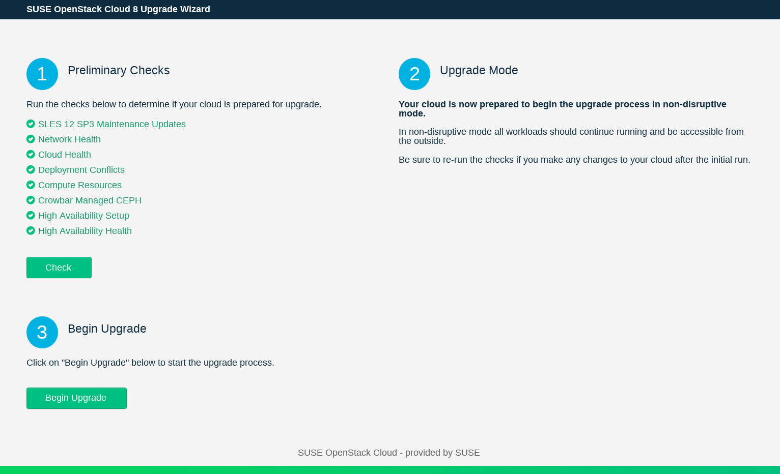When starting the upgrade process, several checks are performed to determine whether the SUSE OpenStack Cloud is in an upgradeable state and whether a non-disruptive update would be supported: