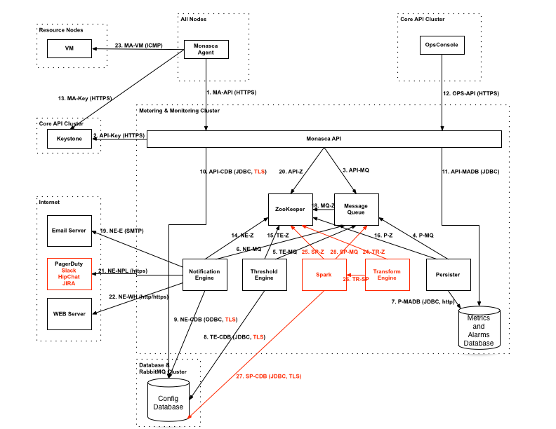 The monitoring service, based on monasca, allows you to configure an external SMTP server for email notifications when alarms trigger. You also have options for your alarm metrics database should you choose not to use the default option provided with the product.