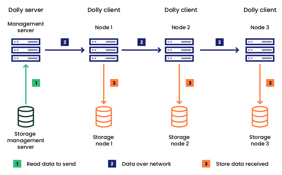 Dolly is used to send data from a management server to many other nodes. It can distribute files, container images, partitions, or whole storage devices.