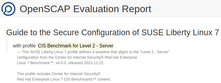 #oscap xccdf eval \--profile xccdf_org.ssgproject.content_profile_cis \1--report /tmp/report.html \2--results-arf /tmp/results-arf.xml \3/usr/share/xml/scap/ssg/content/ssg-sles_esp7-ds.xml4