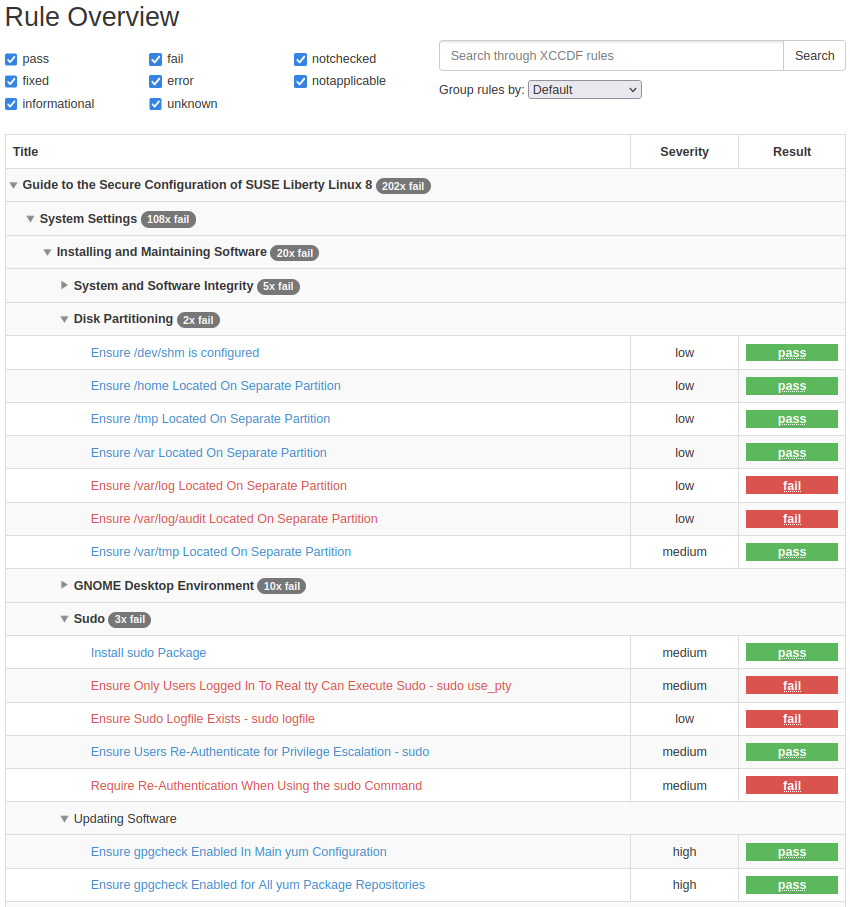 Figure 3: Partial list of rules in a typical OpenSCAP report #- Rule details and remediation