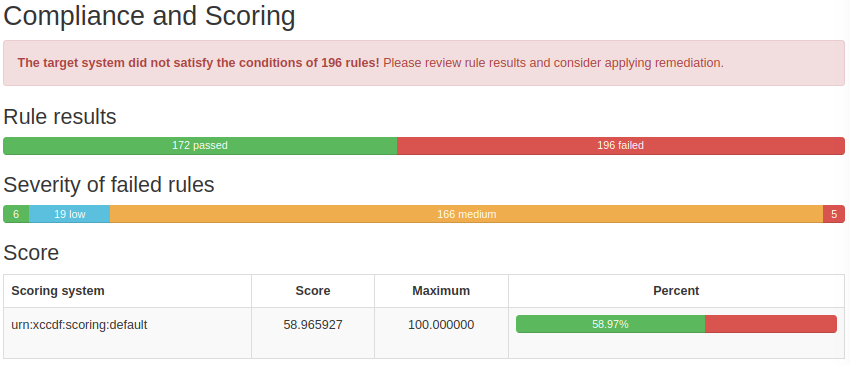 The compliance scan collects information from the target system and evaluates it against rules set by the selected compliance profile. The scan will take some time to complete. The results are saved in the specified files and also appear on screen, as shown in this example snippet: