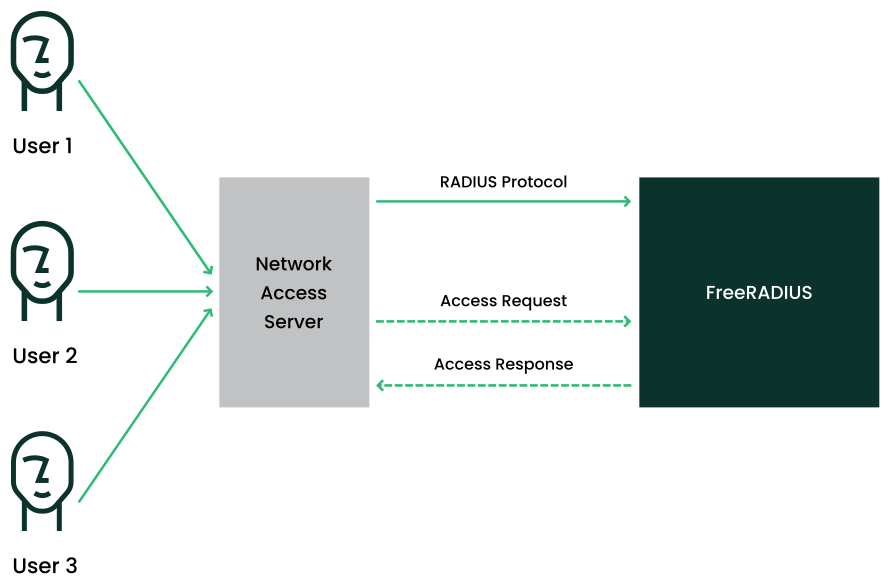 RADIUS operates over a distributed architecture and runs separately from the Network Access Server (NAS). User access data is stored on a central RADIUS server that is available to multiple NAS devices. The NAS provides physical access to the network, such as a managed Ethernet switch or a wireless access point. FreeRADIUS verifies and manages network access and operations. FreeRADIUS ensures secure communication between network devices and user authentication servers. To set up a FreeRADIUS server, you must install, configure and define user accounts, and define and determine authentication and authorization for FreeRADIUS. After installing FreeRADIUS, you must test the function by integrating FreeRADIUS with the devices to be managed.