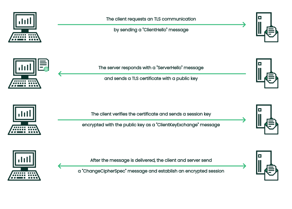 The following steps illustrate the process of establishing secure communication between the client and the server. The process is often referred to as a TLS handshake.