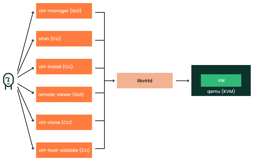 libvirt tools are designed to work with the libvirt API and support virtualization technologies and hypervisors. You can use the libvirt-based tools for managing VM Guests. Commonly used tools for libvirt are virsh, virt-manager, virt-install, virt-clone, virt-image, and so on. libvirt supports using graphical user interface and commands to write XML configurations.
