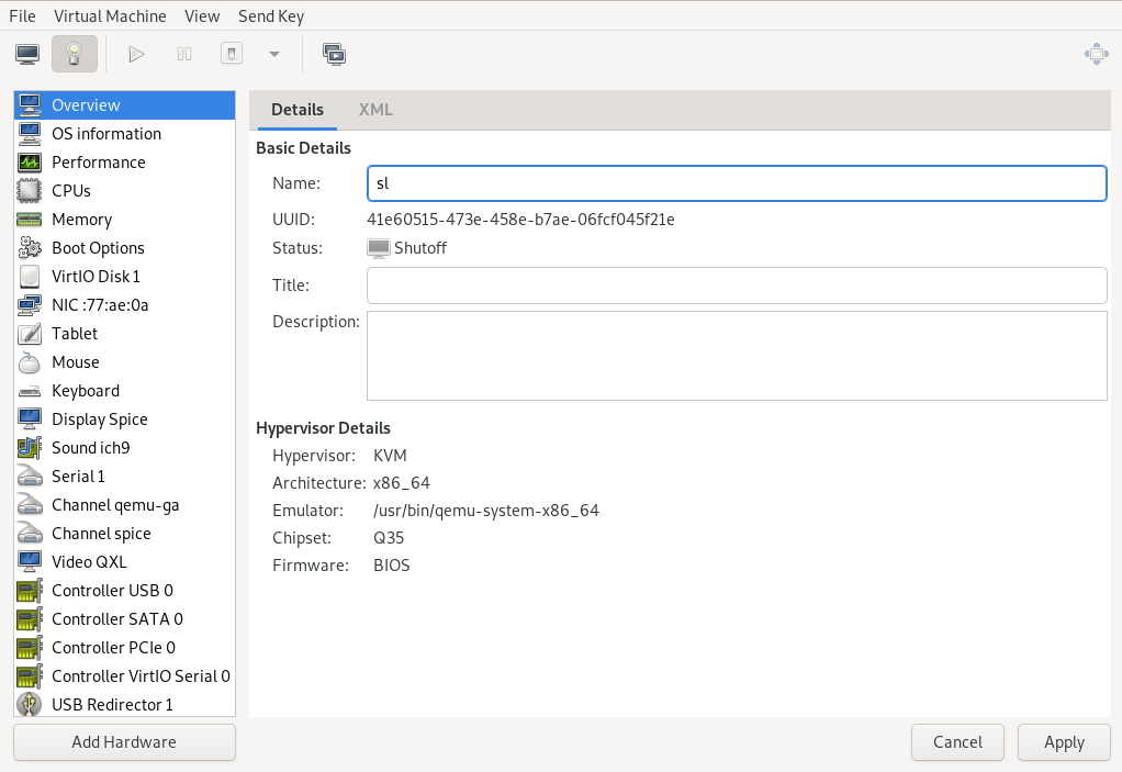 The view of the Virtual Machine Manager displays detailed information about the VM Guest's complete configuration and hardware equipment. Using this view, you can also change the guest configuration or add and modify virtual hardware to an existing virtual machine.