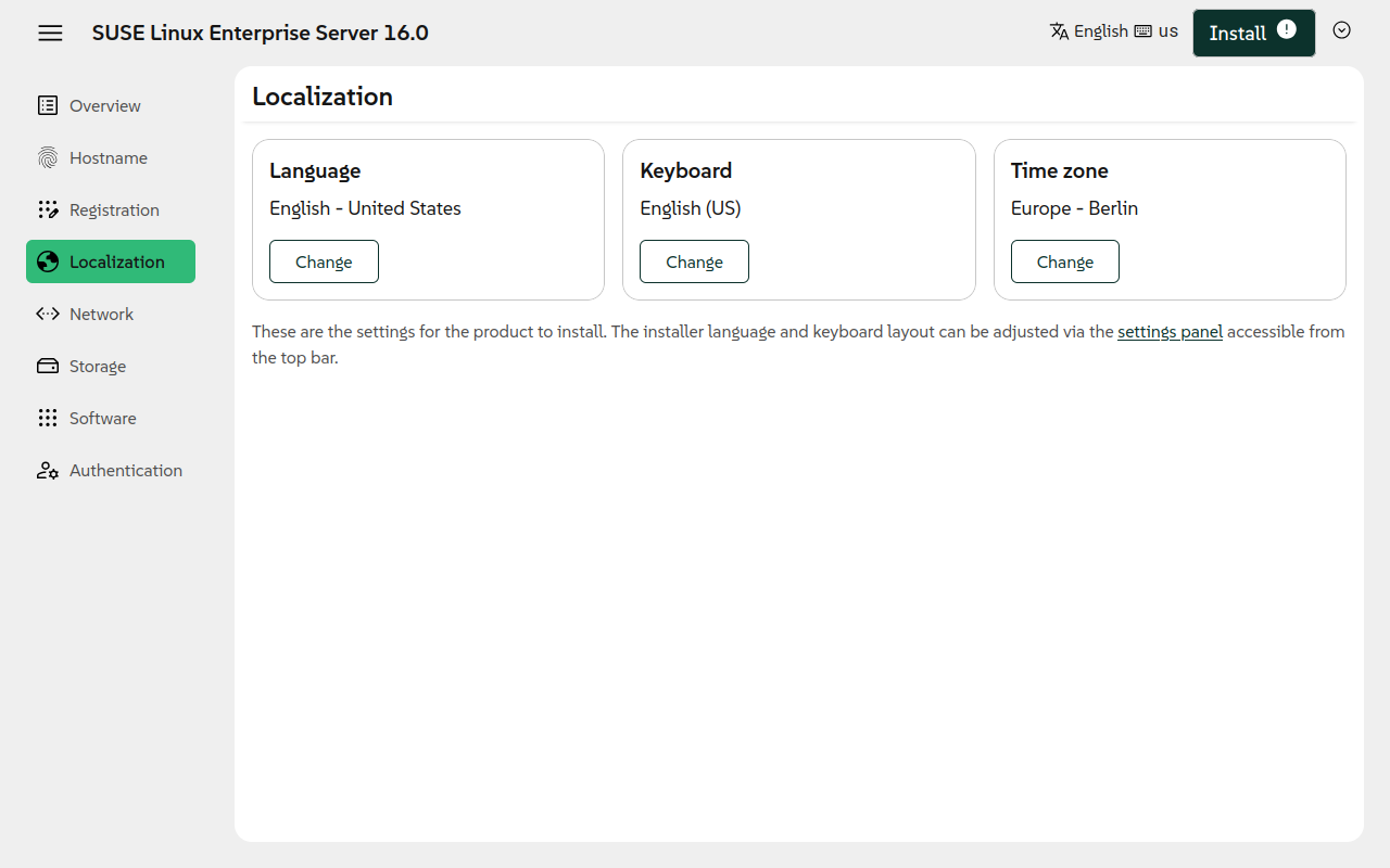 Tip: Installer language and keyboardClick the arrow menu in the top right corner and select to change the language and keyboard layout used by the installer. The language can only be changed on local installations. If you are using a web browser for a remote installation, configure the preferred content language in the browser settings and reload the installer.