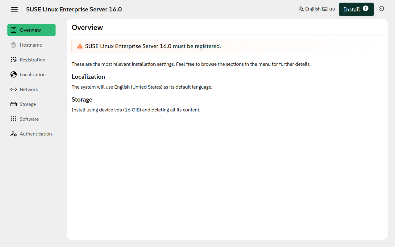 This section provides a short overview of Agama, which is the default installer for SUSE Linux Enterprise Server 16.0 and later versions.