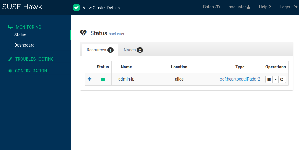 A user-friendly Web-based interface for monitoring and administering a High Availability cluster from Linux or non-Linux machines. Hawk can be accessed from any machine that can connect to the cluster nodes, using a graphical Web browser.