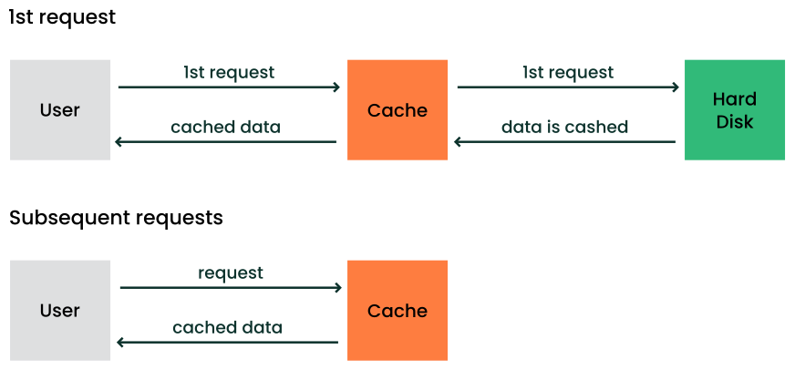 Normally, a disk cache stores the most recent and frequently used programs and data. When a user or program requests data, the operating system first checks the disk cache. If the data is there, the operating system quickly delivers the data to the program instead of rereading the data from the disk.