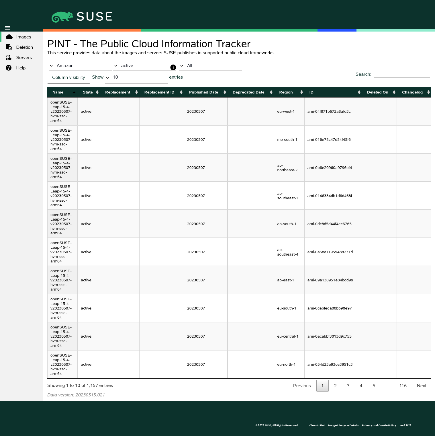 The Public Cloud Information Tracker (PINT) provides information about the images SUSE publishes