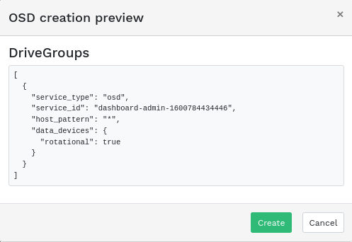 Figure 4.12: Create OSDs with primary devices added #Click to view the preview of DriveGroups specification for the devices you previously added. Confirm with .