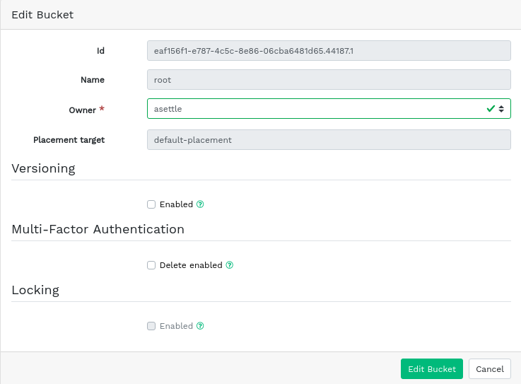 At this stage you can also enable locking by selecting ; however, this is configurable after creation. See Section 9.3.3, “Editing the bucket” for more information.