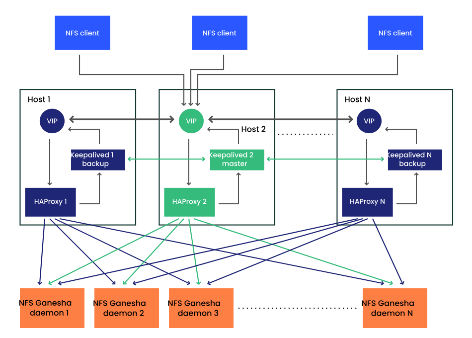 You can create high availability (HA) endpoints for the NFS Ganesha service by deploying Ingress. Ingress includes a combination of HAProxy and Keepalived to provide load balancing on a floating virtual IP address. A virtual IP address is automatically configured only on one of Ingress hosts at a time.