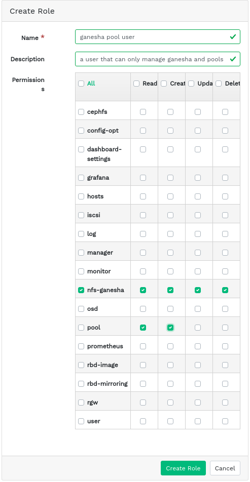 --cap osd 'allow rwx' --cap mon 'allow rwx'To update the modified user within the Ceph cluster environment, you must import the changes from the keyring to the user entry in the Ceph cluster: