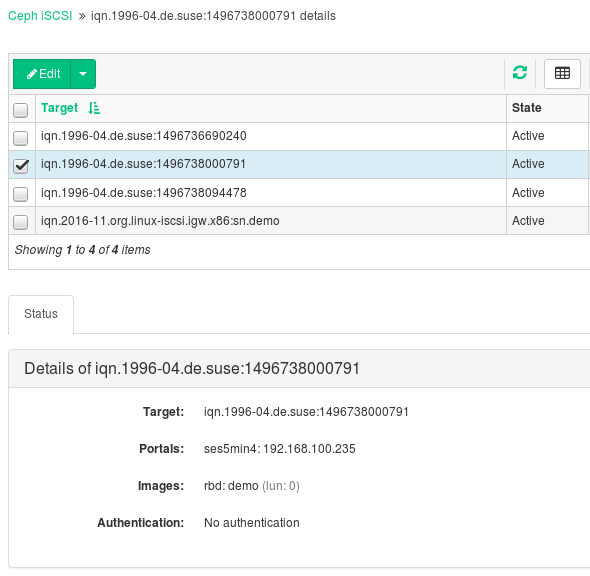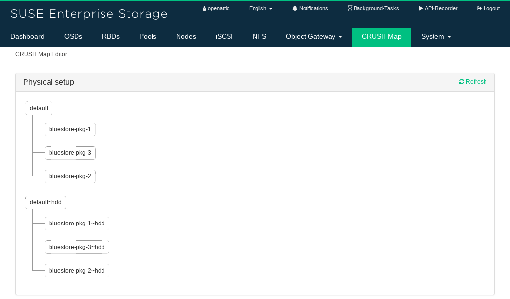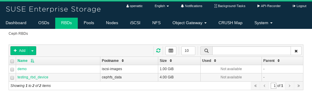 Added iSCSI Gateway and Object Gateway configuration for openATTIC, see Section 17.1.5, “Object Gateway Management” and Section 17.1.6, “iSCSI Gateway Management” (Fate #320318 and #321370).
