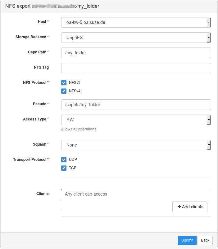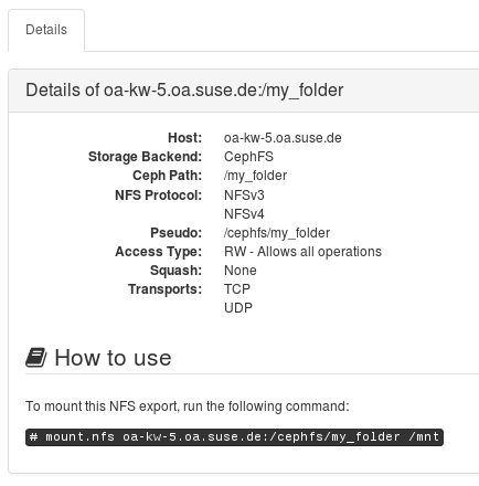 role-ganeshain Book “Deployment Guide”, Chapter 12 “Installation of NFS Ganesha”, Section 12.1.2 “Summary of Requirements” (https://bugzilla.suse.com/show_bug.cgi?id=1107625).Added Section 16.3.3, “Supported Operations” (https://bugzilla.suse.com/show_bug.cgi?id=1107624).
