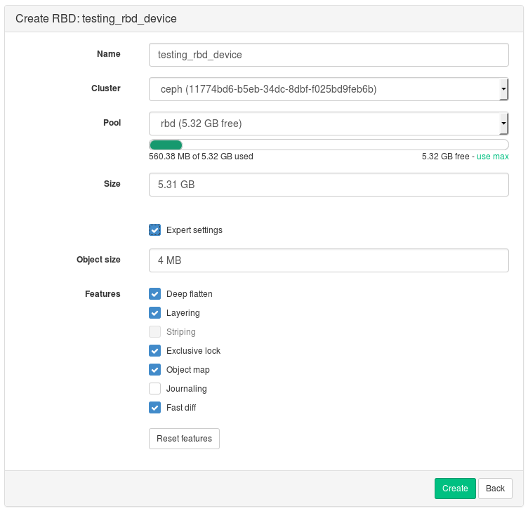 RBD images can now be stored in EC pools, see Section 9.1.2, “Creating a Block Device Image in an Erasure Coded Pool” (https://bugzilla.suse.com/show_bug.cgi?id=1040752).