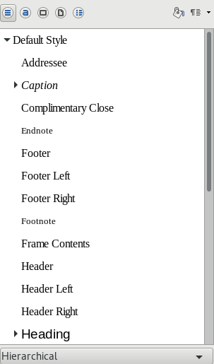LibreOffice comes with several predefined styles. You can use these styles as they are, modify them, or create new styles. Use the icons at the top of the panel to display formatting styles for the most common elements such as paragraphs, frames, pages or lists. To learn more about styles, continue with the instructions below.