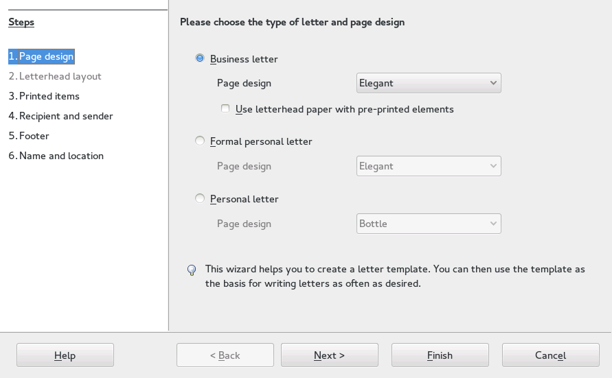 For example, to create a business letter, click › › . Using the wizard, you can easily create a basic document using a standard format. A sample wizard dialog is shown in Figure 11.1.