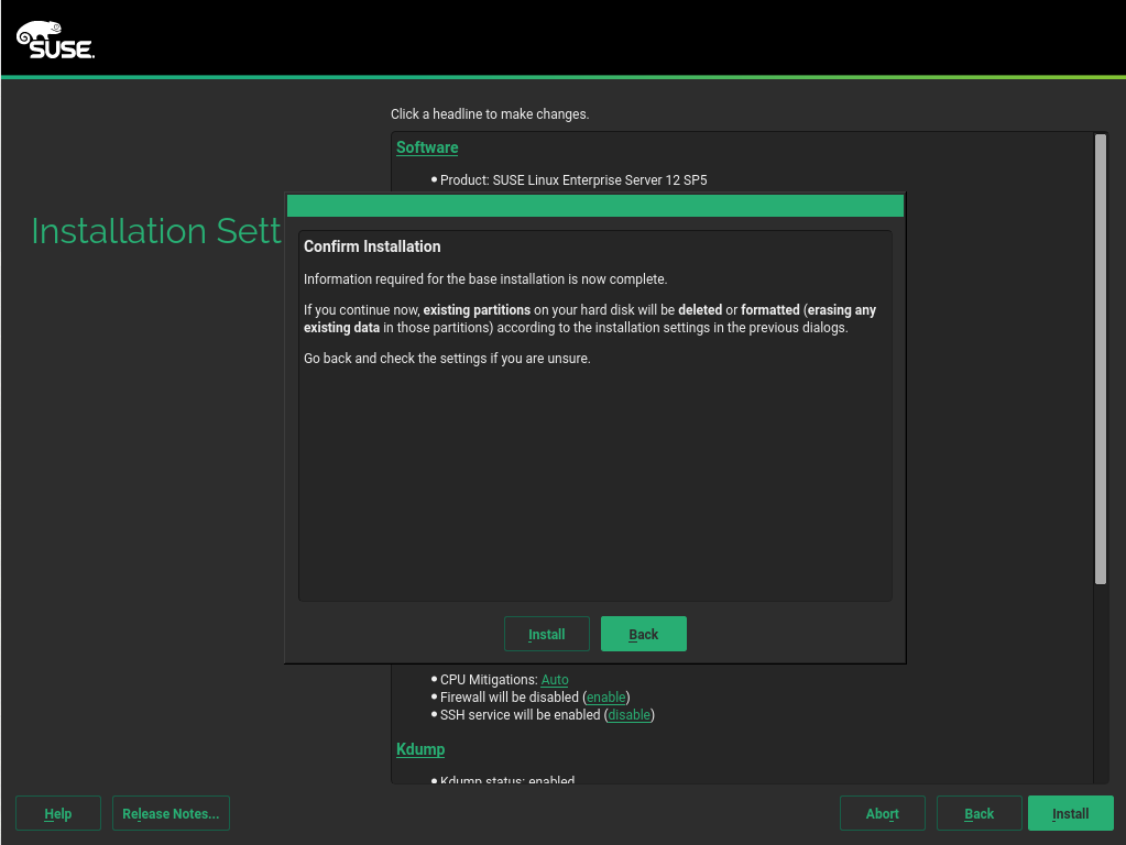 Use the following procedures to install a new version of SUSE® Linux Enterprise Server 12 SP5. This document gives a quick overview on how to run through a default installation of SUSE Linux Enterprise Server for the AMD64/Intel 64 architecture.