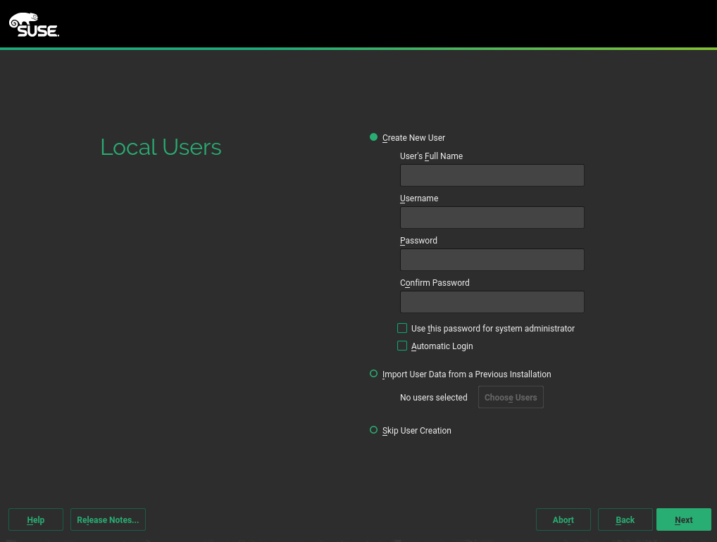 rootpassword! After you entered it here, the password cannot be retrieved. See Book “Deployment Guide”, Chapter 6 “Installation with YaST”, Section 6.14 “Password for the System Administratorroot” for more information. Proceed with .Tip: Passwords and Keyboard LayoutIt is recommended to only use US ASCII characters. In case of a system error or when you need to start your system in rescue mode, the keyboard may not be localized.
