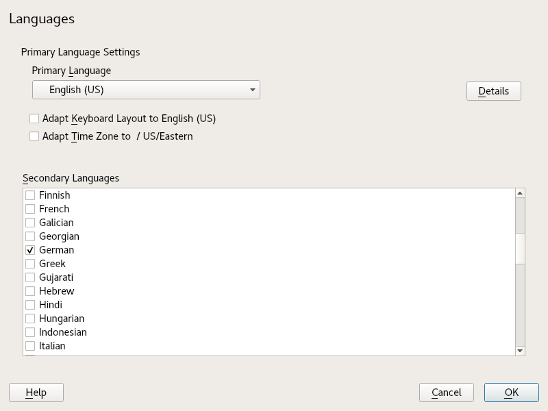 Important: Deleting Former System LanguagesIf you switch to a different primary language, the localized software packages for the former primary language will be removed from the system. To switch the default system language but keep the former primary language as additional language, add it as by enabling the respective check box.