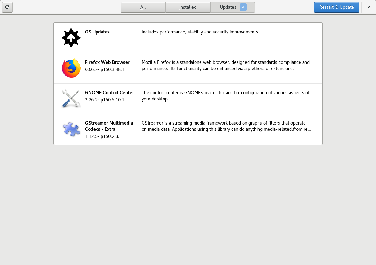 Contrary to the YaST Online Update module, the GNOME not only offers to install patches from the update repositories, but also new versions of packages that are already installed. (Patches fix security issues or malfunctions; the functionality and version number is usually not changed. New versions of a package increase the version number and usually add functionality or introduce major changes.)