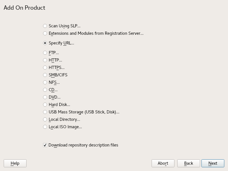 For the majority of repositories, you will be asked to specify the path (or URL) to the media after selecting the respective option and clicking . Specifying a is optional. If none is specified, YaST will use the product name or the URL as repository name.