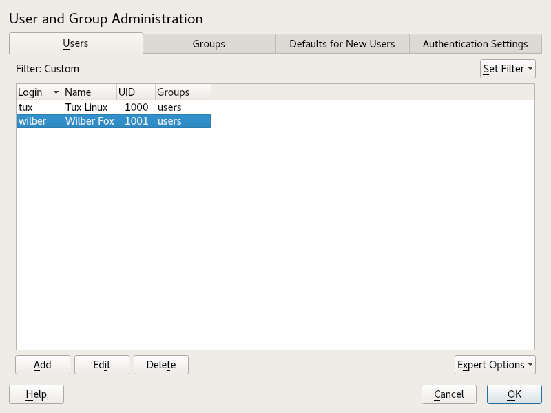 Local users are assigned to several groups according to the default settings which you can access from the dialog on the tab. In the following, learn how to modify an individual user's group assignment. If you need to change the default group assignments for new users, refer to Section 24.4, “Changing Default Settings for Local Users”.
