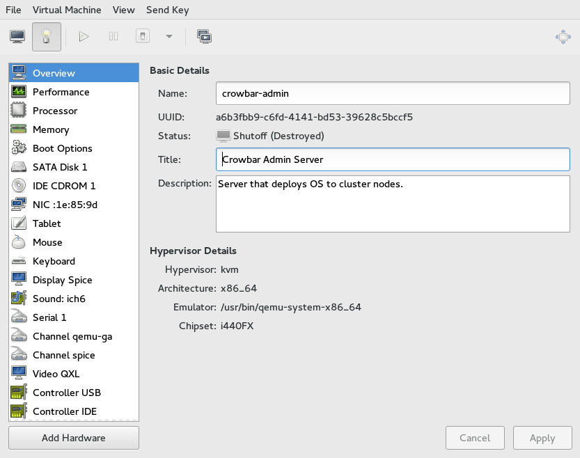 Virtual Machine Manager's view offers in-depth information about the VM Guest's complete configuration and hardware equipment. Using this view, you can also change the guest configuration or add and modify virtual hardware. To access this view, open the guest's console in Virtual Machine Manager and either choose › from the menu, or click in the toolbar.
