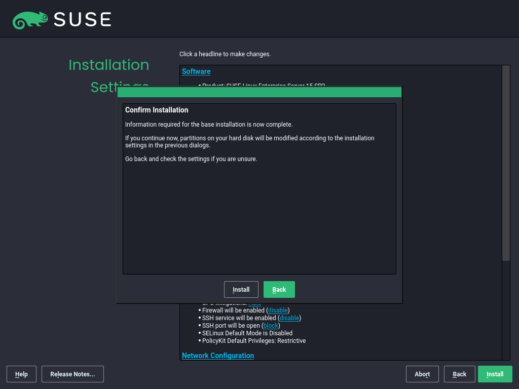 After you have finalized the system configuration on the screen, click . Depending on your software selection you may need to agree to license agreements before the installation confirmation screen pops up. Up to this point no changes have been made to your system. After you click a second time, the installation process starts.