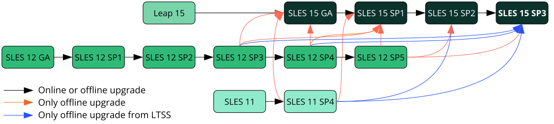 The easiest upgrade path is consecutively installing all service packs. For the SUSE Linux Enterprise 15 product line (GA and the subsequent service packs), skipping from one to any other service pack is technically possible, but not officially supported. For a supported upgrade path, only up to two service packs may be skipped, and your system needs to be on a supported tier before launching the upgrade (fully upgraded LTSS when out of regular support). For example, upgrading from SLE 15 GA to 15 SP3 is not supported, as SP1 is out of regular support before SP4 is released. However, the upgrade from SLE 15 GA LTSS to 15 SP3 or SP2 LTSS is supported.
