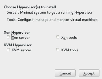 The following libvirt-based graphical tools are available on SUSE Linux Enterprise Server. All tools are provided by packages carrying the tool's name.