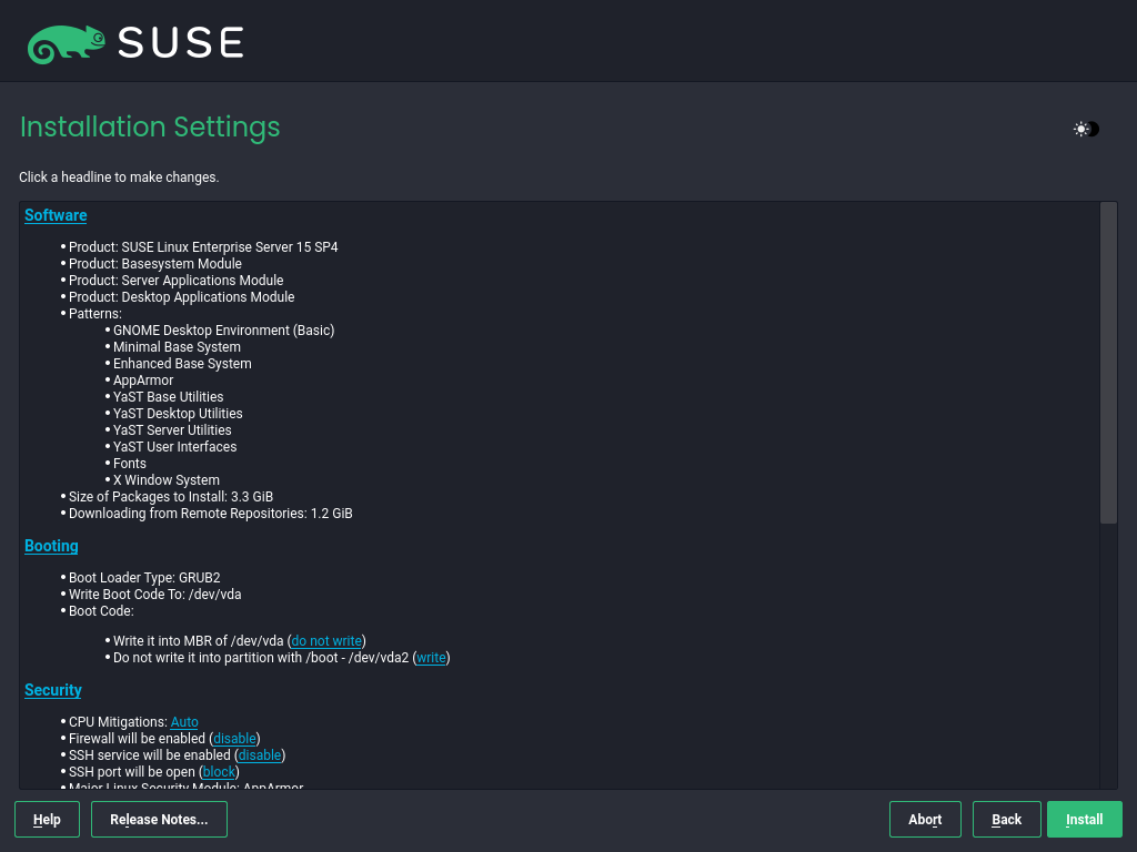 If you are a first-time user of SUSE Linux Enterprise Server, you should follow the default YaST proposals in most parts, but you can also adjust the settings as described here to fine-tune your system according to your preferences. Help for each installation step is provided by clicking .