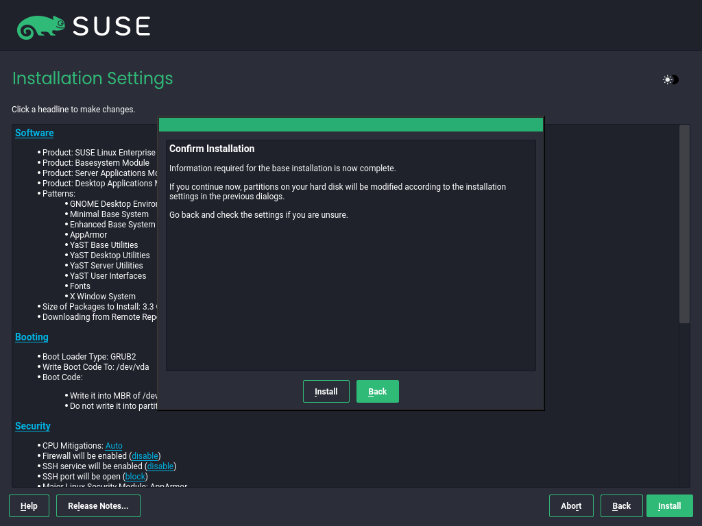 After you have finalized the system configuration on the screen, click . Depending on your software selection you may need to agree to license agreements before the installation confirmation screen pops up. Up to this point no changes have been made to your system. After you click a second time, the installation process starts.