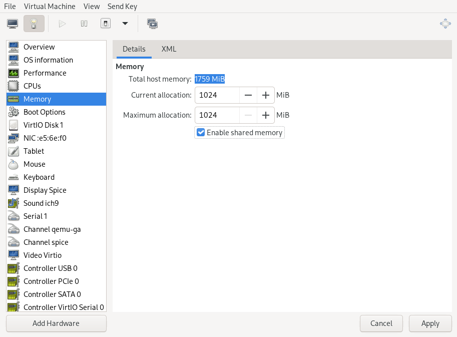 memfdbacked. It is a requirement for using the virtiofs file system. Find more details in https://libvirt.org/kbase/virtiofs.html.The maximum value to which you can hotplug the currently available memory. Any change to this value will take effect after the next VM Guest reboot.