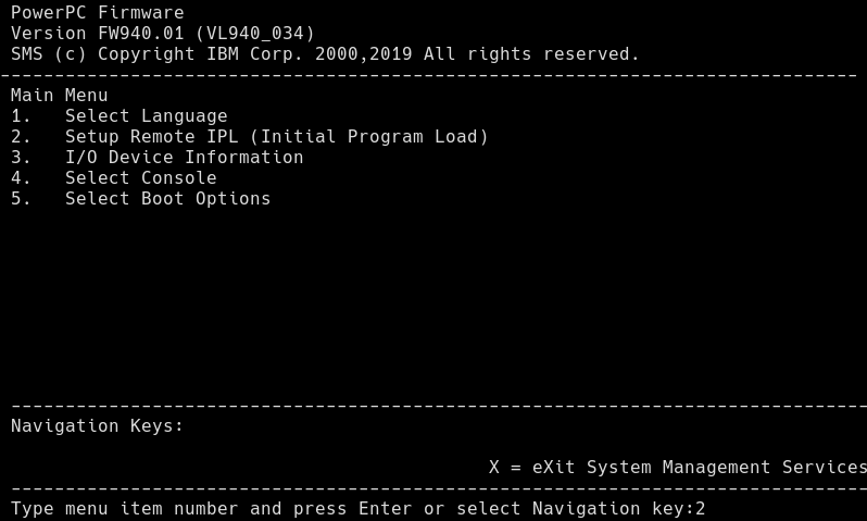 Setup Remote IPL (Initial Program Load)by pressing2and Enter.Select the NIC Adapter for accessing your TFTP server.