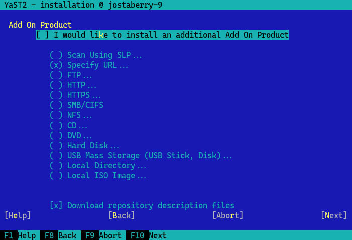 Next, choose the desired product registration method and complete the registration. If you register the system using the SUSE Customer Center, you are prompted to enable update repositories. Press